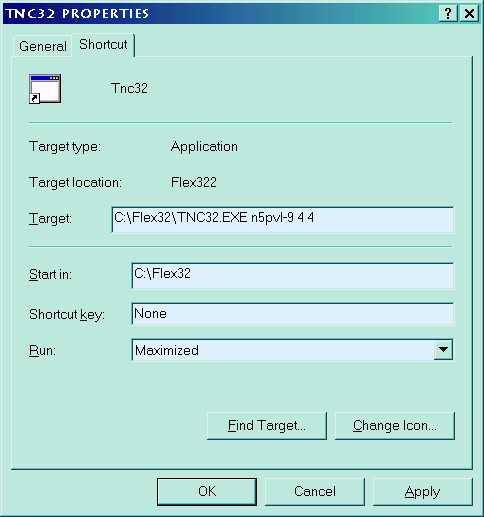 Tnc32 is a command-line program. That means a set of parameters must be given along with the program name, in order for it to work. To do this, right-click the icon for Tnc32.exe on your desktop, and choose PROPERTIES from the pop-up menu.