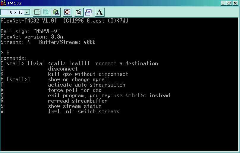 To enter a command in TNC32, press the ESCAPE key and a command prompt will appear. Here, I have brought up the command prompt and entered H for Help: